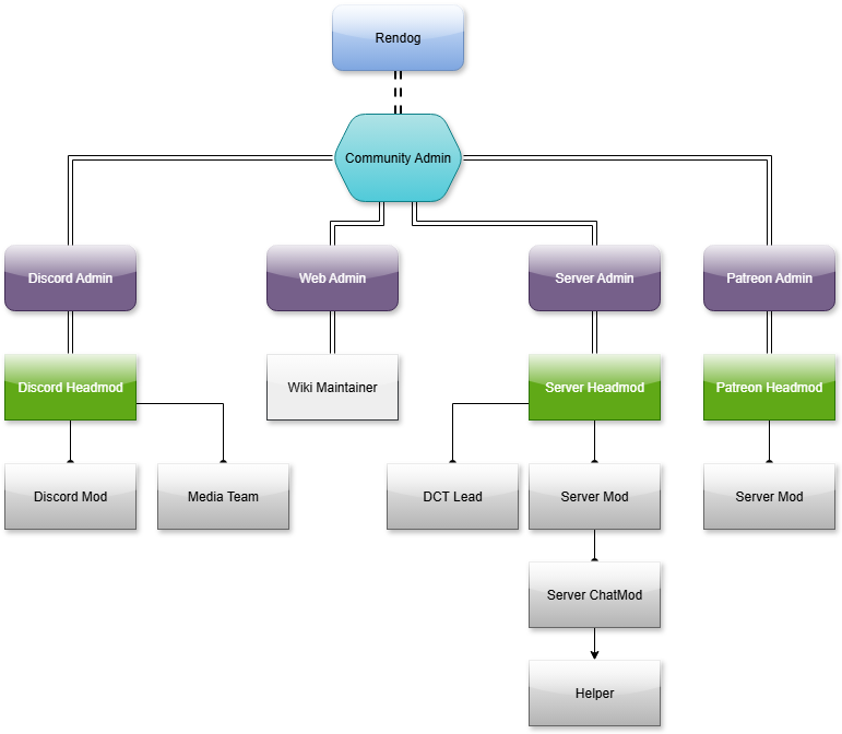 The Dogcraft management structure is organized into five main administrative branches under the leadership of the Community Admin, who reports to Rendog. Each branch has specific roles and responsibilities: